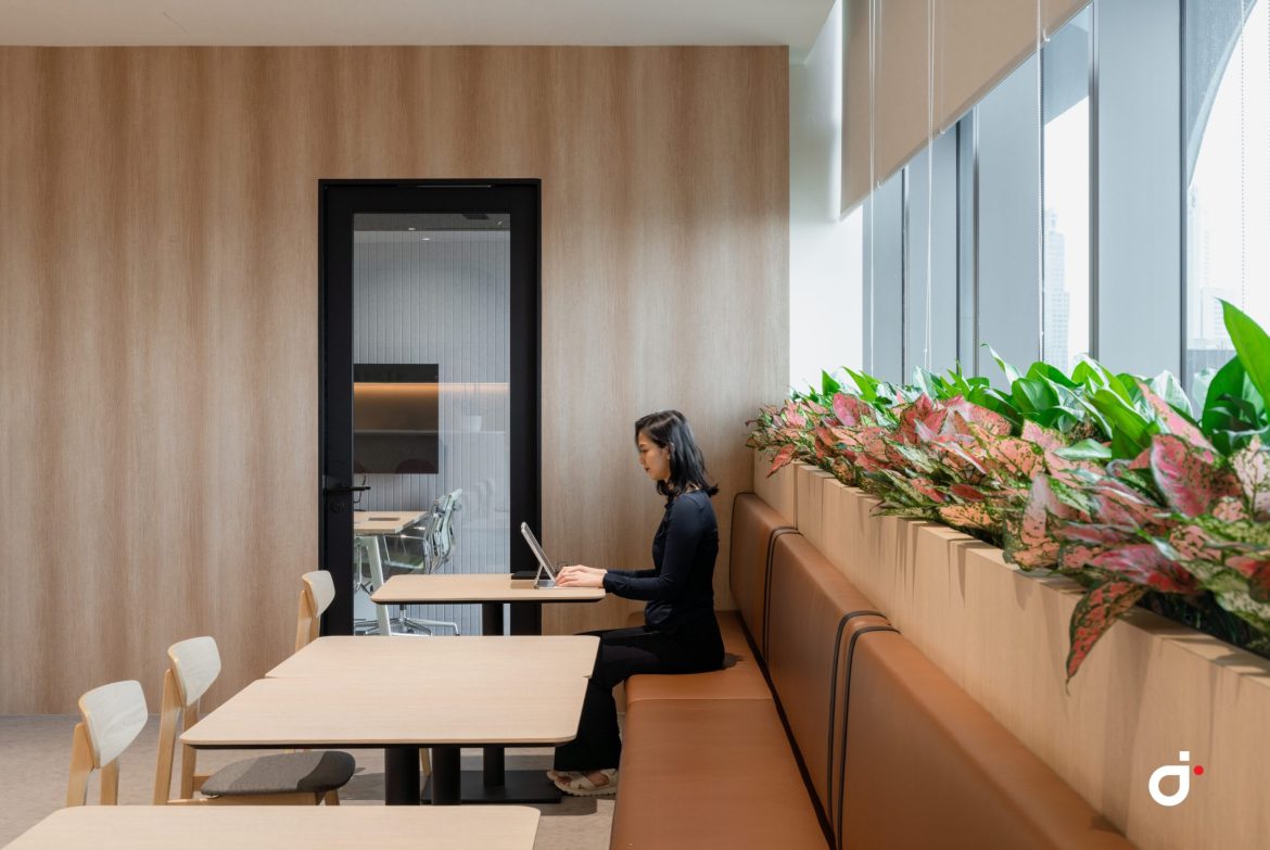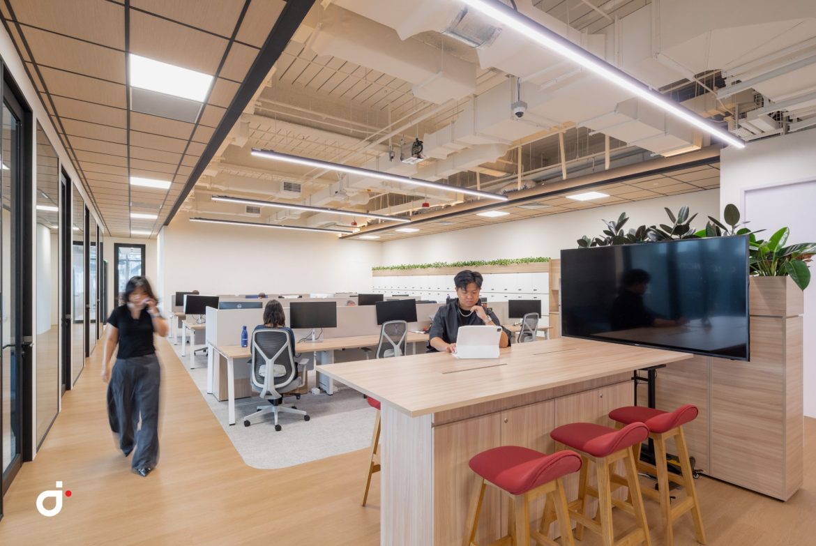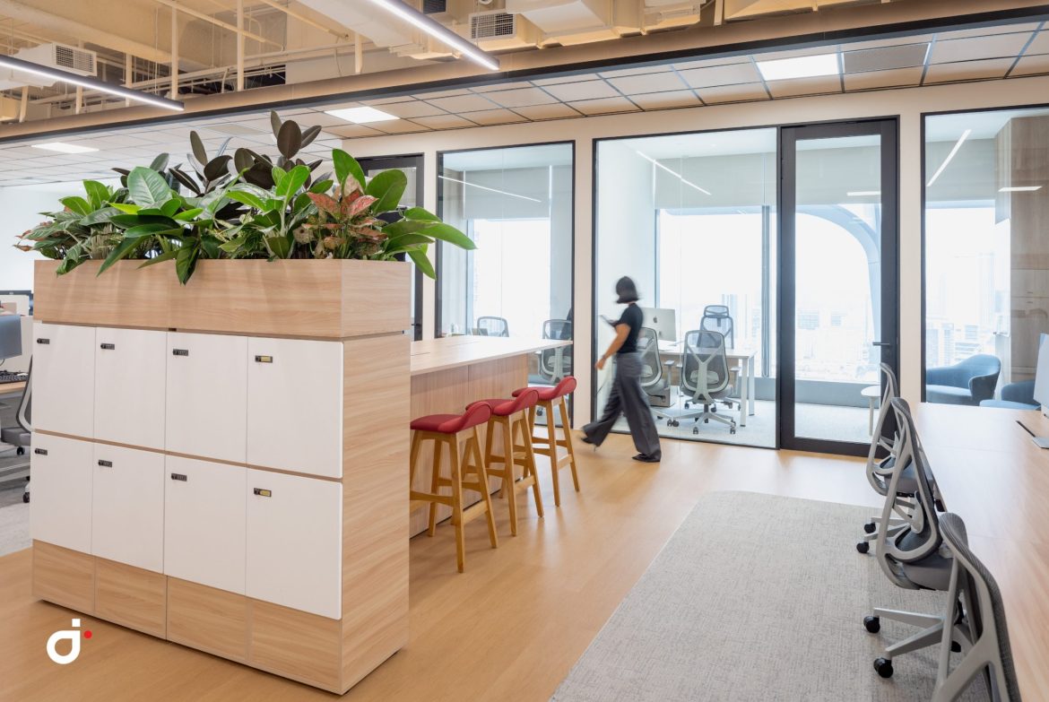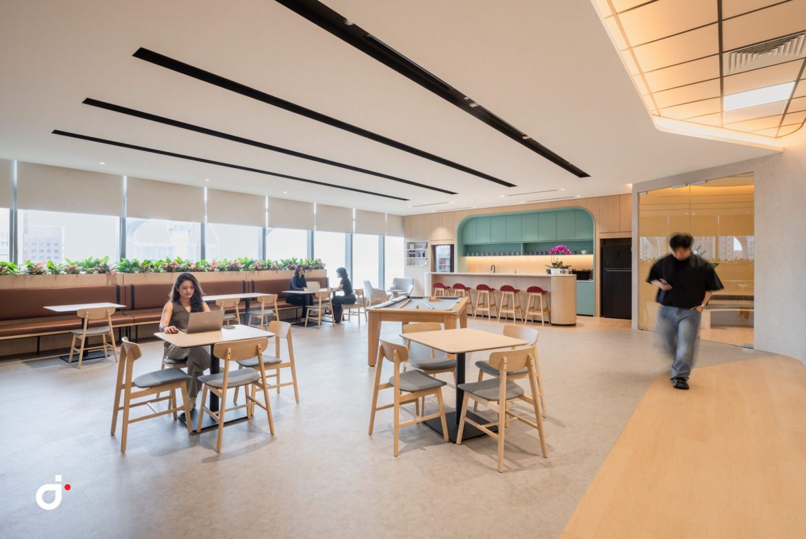 Beyond this point, the layout opens into a vibrant townhall and workcafé breakout zone at the front of the office. This active area sets a dynamic tone for interaction and engagement. Behind this social hub, offices and workstation zones are carefully positioned to reduce noise and distractions, ensuring employees have spaces for both collaboration and focused work.