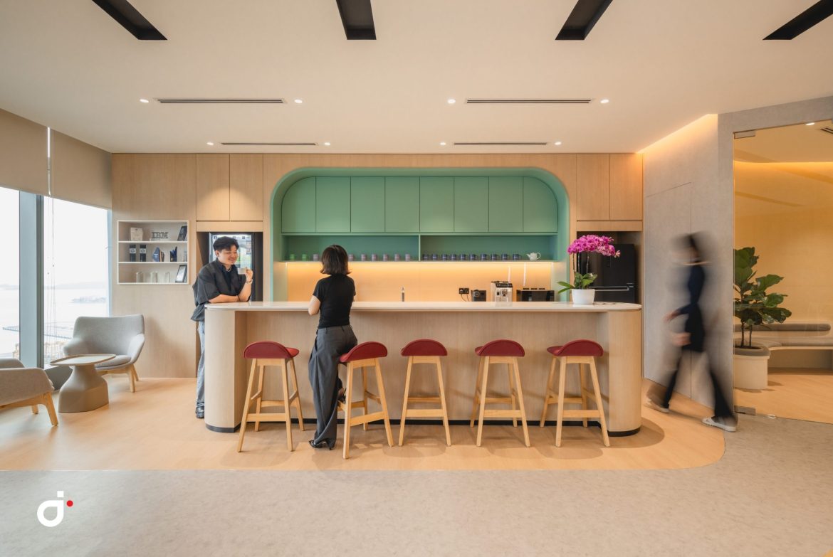 Flexibility and thoughtful functionality play a central role in the design. At the heart of the office, a convertible pool table in the townhall area transforms into a discussion table with a custom timber plank, allowing the same space to support both informal recreation and collaborative meetings. Several rooms are subtly concealed with full-height wallpaper treatments, allowing doors to blend seamlessly into surrounding walls and maintaining a refined, uncluttered visual language. The pantry is reimagined as a workcafé, drawing inspiration from hospitality settings to encourage casual conversations, informal meetings, and social connection among employees.